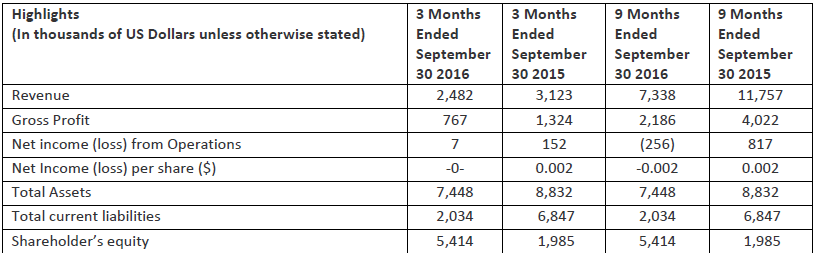 TORONTO, ON / November 14, 2016 / Wi2Wi Corporation (“Wi2Wi” or the “Company“)(TSX-V:YTY) announces results for the quarter ending September 30, 2016.